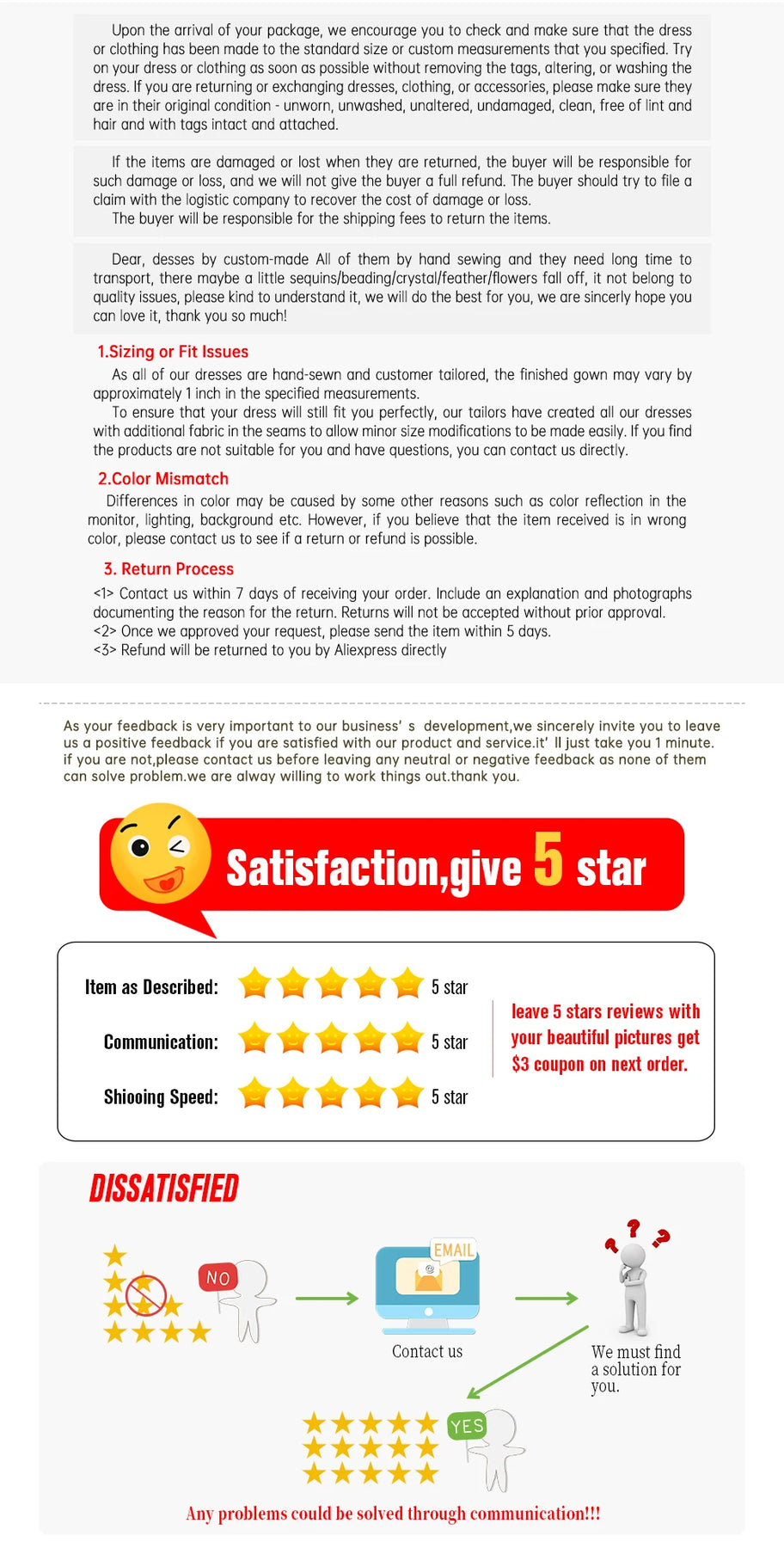 1. As an honest seller, we guarantee the dress will be 90%- 99% same as original picture shown